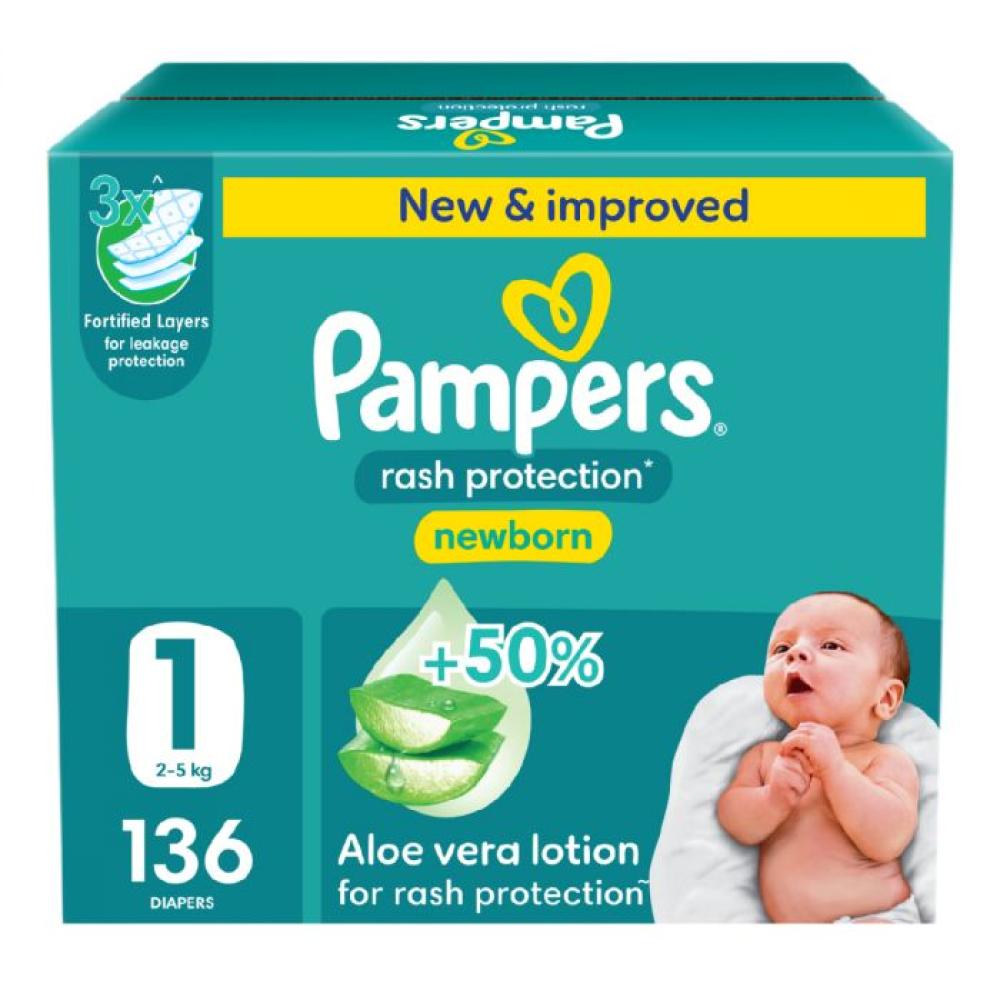 • حفاضات بامبرز للحماية من التسلخات مع الأشرطة، مقاس 1، 2 إلى 5 كلغ، صندوق جامبو، 136 قطعة