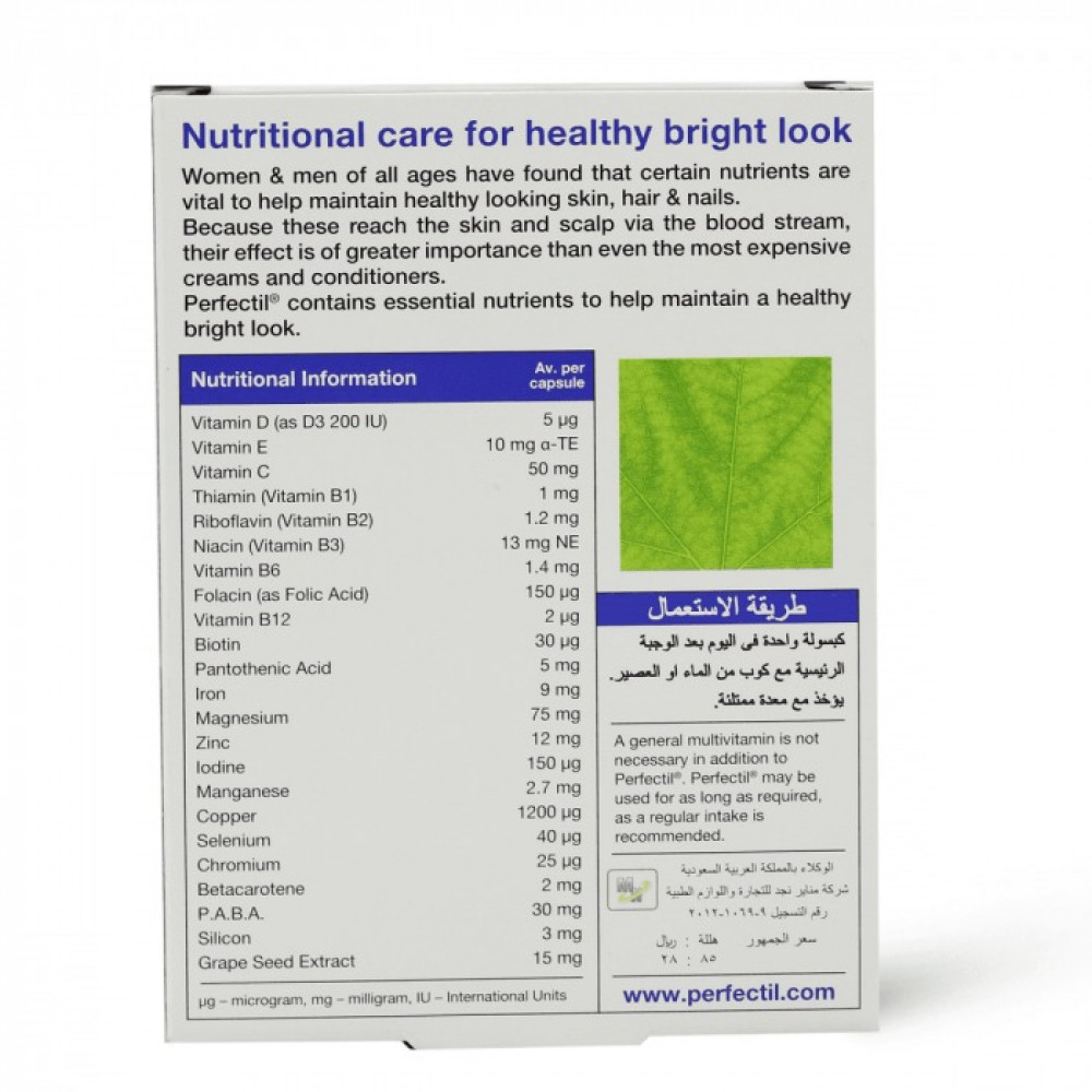 - تحتوي كل كبسولة من برفيكتيل على العناصر الغذائية الأساسية، المصممة خصيصًا للمساعدة في الحفاظ على مظهر صحي ومشرق