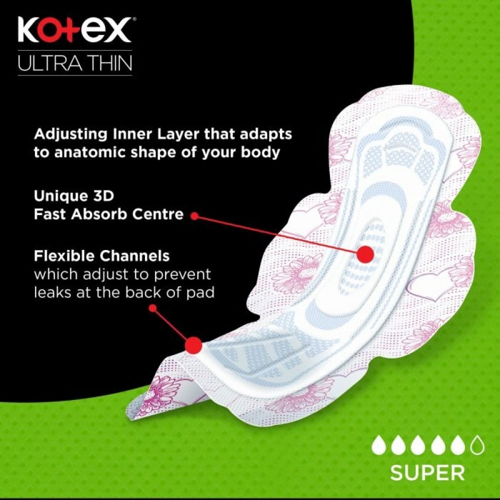 - تعرفي على فوط الترا الرفيعة سوبر الجديدة وذات الامتصاص العالي لتوفر لك المزيد من الطمأنينة. يمنحك تصميمها الامتصاص السريع لأقصى درجات الراحة والشعور الجاف، في حين أن تصميم نماذج الأزهار الجديد سيبهجك