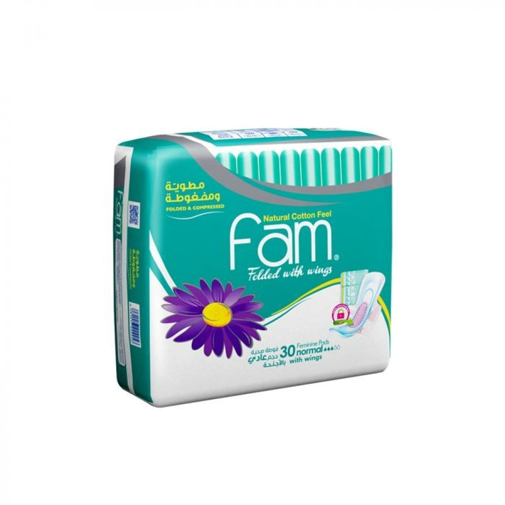• فام ماكسي مطوية بالأجنحة حجم عادي متوفّرة بـ 30 فوطة مغلّفة إفراديًّا لاستعمال نظيف وعمليّ. وهي تؤمّن لك حماية مثالية مع ملمس القطن الطبيعي.