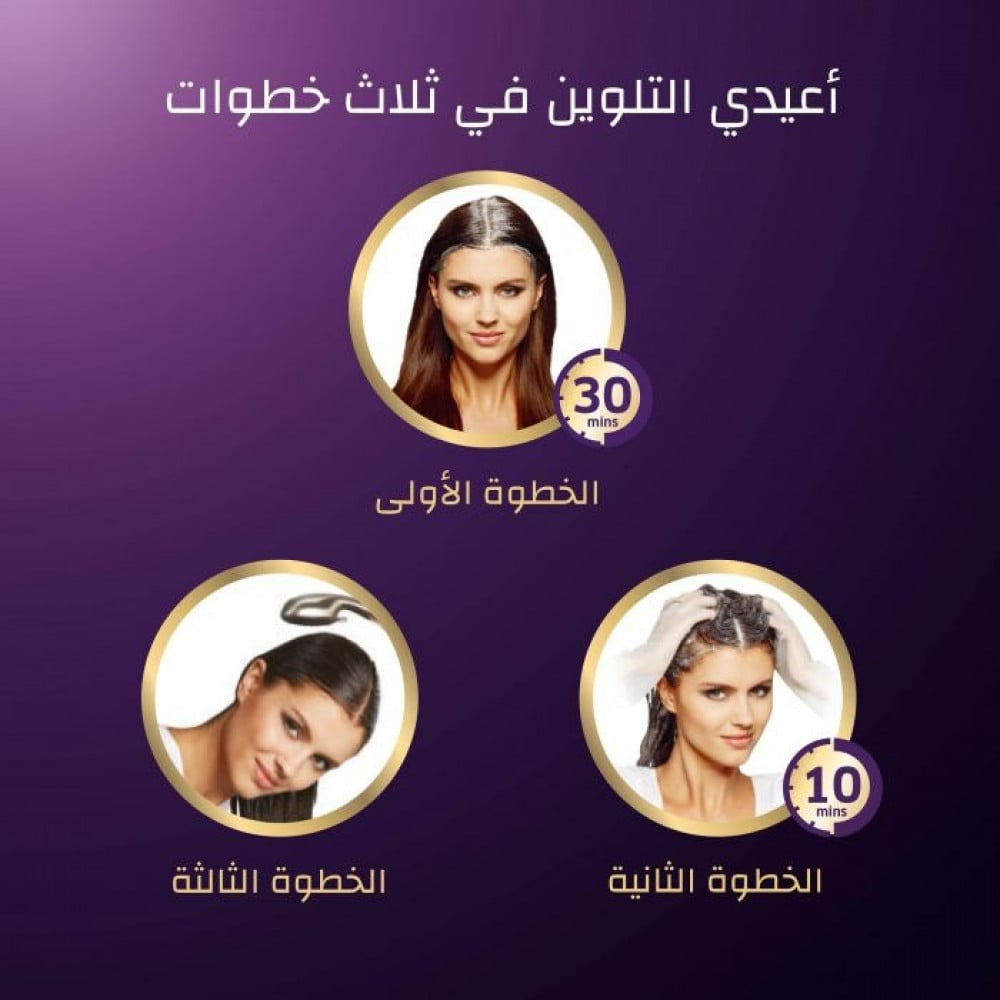 يُقسم الشعر الغير مغسول بالكامل الى أقسام مع مراعاة أن يكون البُعد بينهما 2 سم وذلك بإستخدام طرف أداة التوزيع ز يُضع خليط الصبغة على المنطقة التي تحتوي على شعر حديث النمو حتى تشبعها بالكامل ويُنصح بوضعه بداية من جهة الأمام في إتجاه الخلف قد تروق لك فكرة تقسيم شعرك إلى أجزاء لتتمكني من وضع الخليط بشكل متساوٍ عليه بالكامل قد يختلف لون الخليط ولكن هذا لا يشير إلى اللون النهائي الذي ستحصلين عليه.