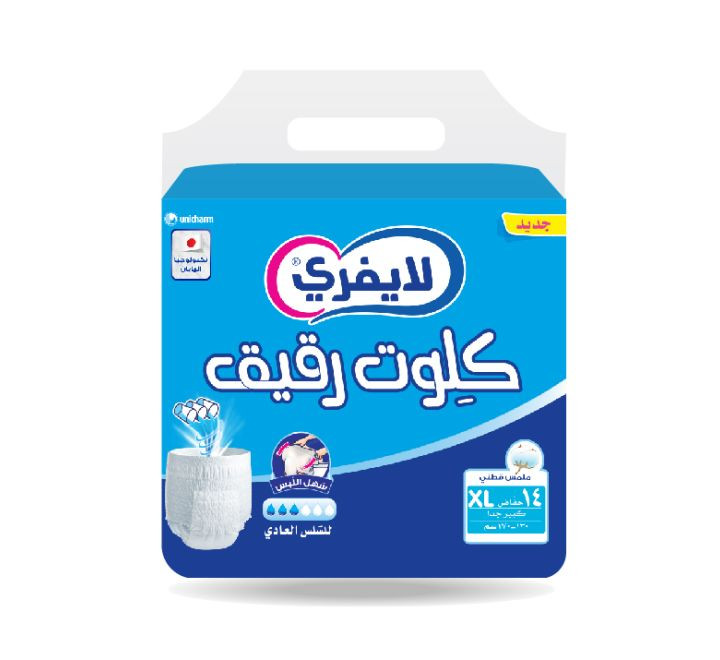 حفاض لايفري كيلوت رقيق بتقنية يابانية عالية الامتصاص للحماية من التسرب. يمتص حتى 3 كاسات مما يسمح للأشخاص الذين يعانون من سلس البول العادي بالعيش والتمتع بحياة طبيعية.